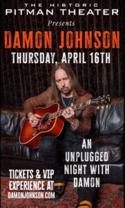 Damon Johnson returns to one of his favorite venues in the country: the historic Pitman Theater in downtown Gadsden. And this event is extra special as it is the night before the full release of the new Brother Cane album, ‘Magnolia Medicine’. Damon will perform acoustically unique verions of songs from the new album as well as many other songs from his catalog that you know and love. He will be accompanied by his old friends Gene Pledger on percussion and Jon Player on bass guitar and vocals. Vinyl and CD versions of ‘Magnolia Medicine’ will be available at The Pitman that night.